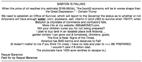 A long-time devoted reader named Nathan has sent me the voter information booklet for Tucson’s upcoming ballot that has a woman who is even crazier. Proposition 200 has to do with water use. If passed, it would repeal the “residential environmental services fee.” I don’t know what it all means, and it doesn’t matter. The point is, here is what a woman named Raquel Baranow paid $500 to say about Proposition 200: