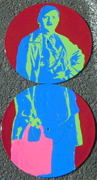 The best thing about this column is that the phrase "sweet Hitler's handbag" inspired art! A reader named Angie Edwards was so tickled by the expression that she used it in a stenciling project, seen here. (Yes, she stenciled it onto two 45-rpm records. Why? Because she's an artist, that's why.) Evidently the piece hung in a Portland art gallery (before I moved there) and was eventually sold to someone else. I don't know where it is now. I do know that Angie also put the image onto a T-shirt and mailed it to me and that it now proudly resides on the rack next to my other novelty T-shirts.