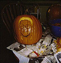 (As a side note, the next year, I received an envelope in the mail that had no return address. Inside was nothing but a Polaroid picture. Naturally, I was apprehensive. I mean, Polaroids are the traditional means of blackmailing people, and I shuddered to think what someone might have snapped a photo of without my knowledge. But it turned out to be merely a photo of a jack-o-lantern someone had carved with my face in it. Ha-ha! Isn't that jolly and festive?! Someone who obviously has a fair amount of talent is using it to carve my likeness into a vegetable. Delightful! There was no hint who it came from, which is too bad, because I would like to have thanked them for the flattery, albeit a very odd means of flattery.)